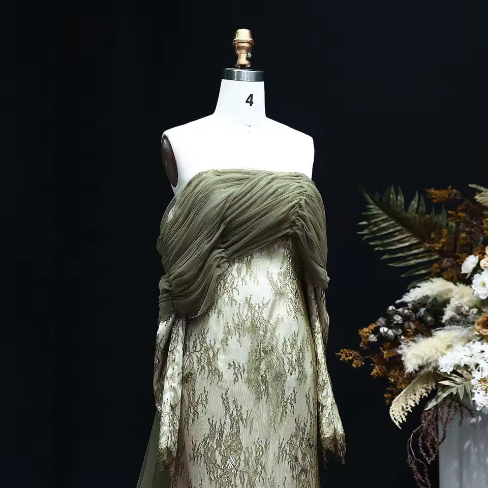 Draped Tulle & Lace Gown with Sheer Flow Cape